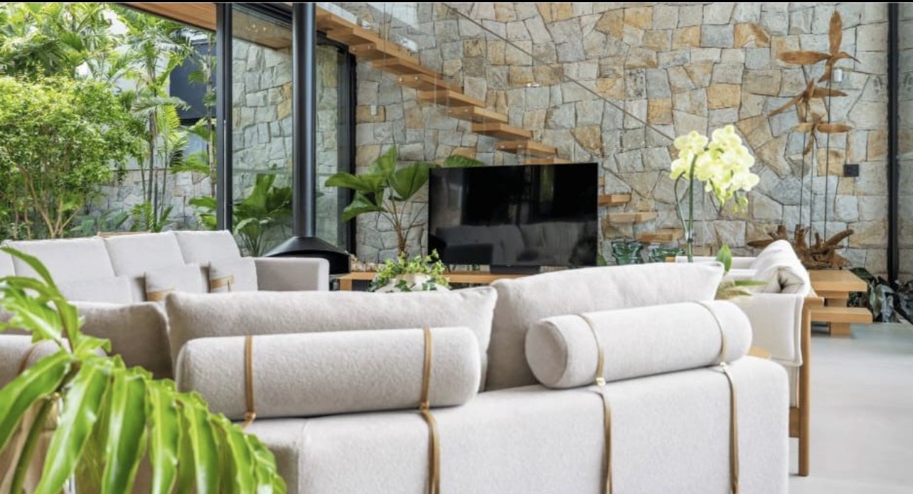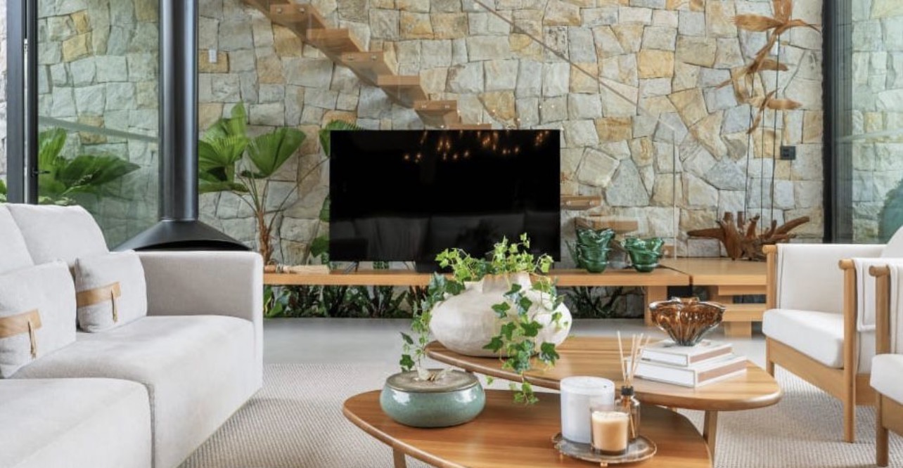 • Escada em madeira e parede em pedra — elementos que trazem identidade